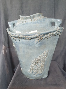 2025Sierlijke vaas opgebouwd uit rollen, waterdicht, creme / lichtgrijs met lichtblauwe glazuur binnen