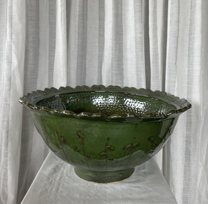 2020grote diepe schaal/kom, mosgroen, sgraffito, steengoed gebakken, met voet, handgevormd