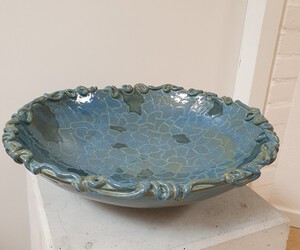 2025blauw schaaltje opgebouwd uit rolletjes en stukjes klei, voor decoratie of om iets in te presenteren
