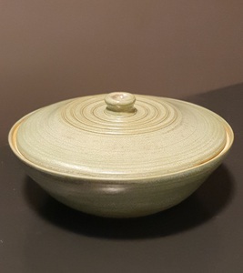 2023steengebakken schaal , gedraaid , met deksel, groen geglazuurd,